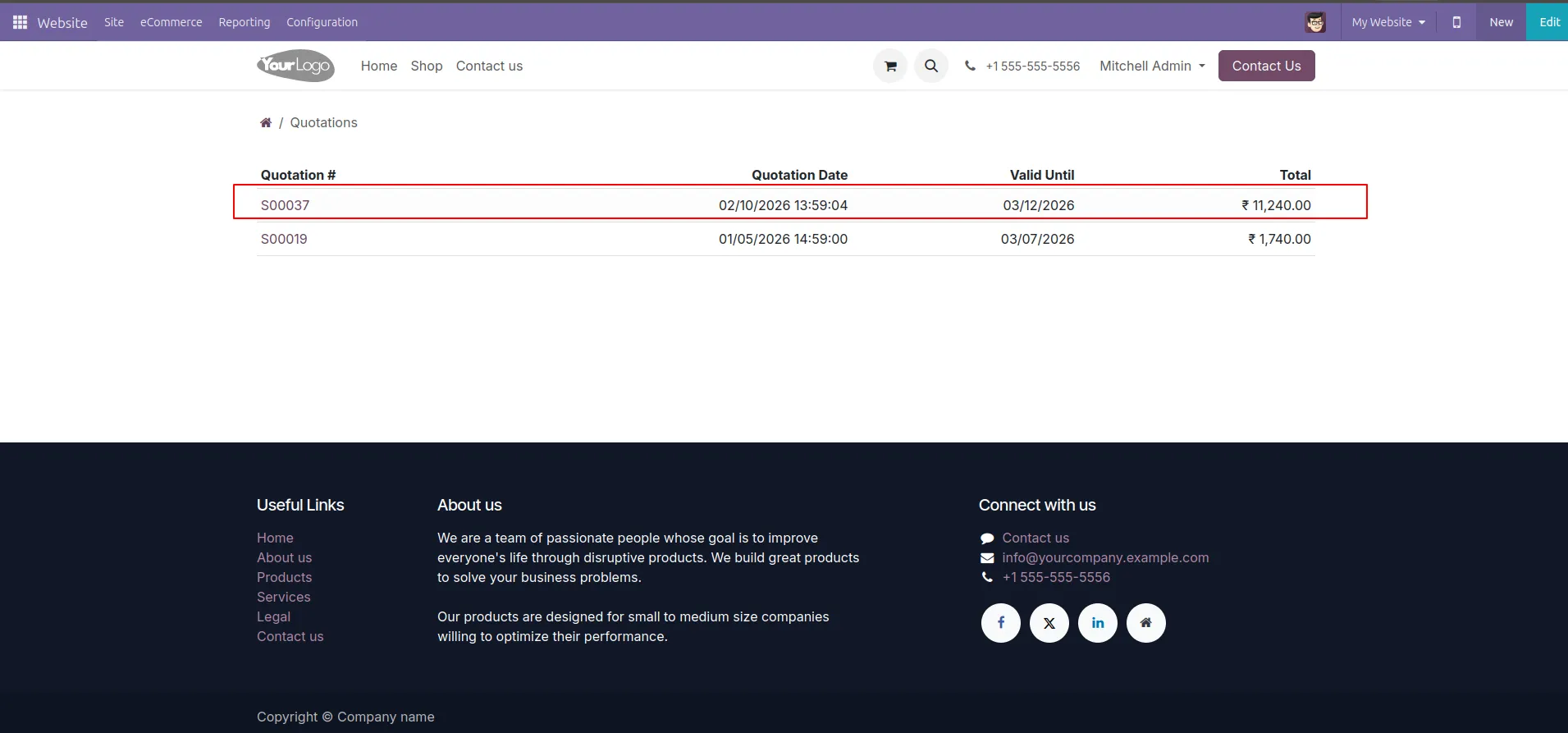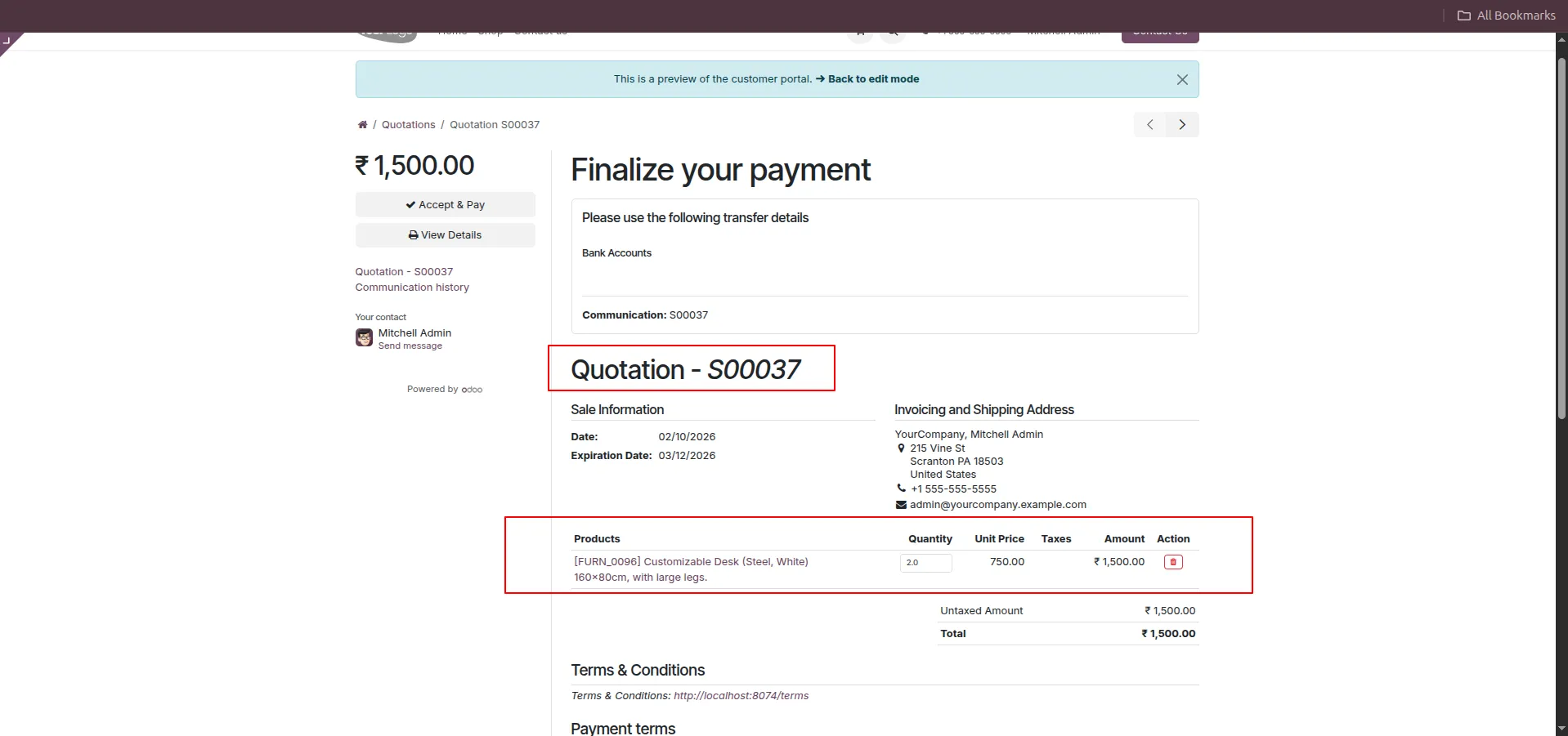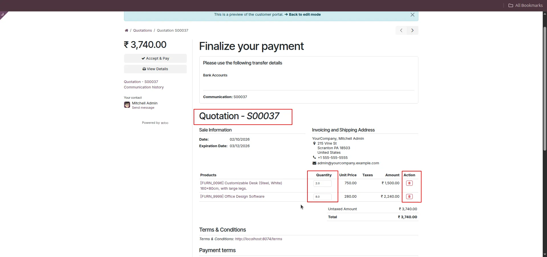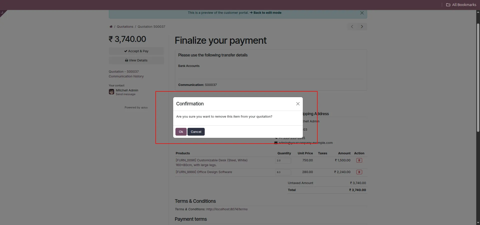 Customers can edit quantities or remove items from the quotation using a simple interface. This makes it easier to edit quantity in Odoo quotation or delete lines in Odoo quotation without requiring manual updates from the sales team.